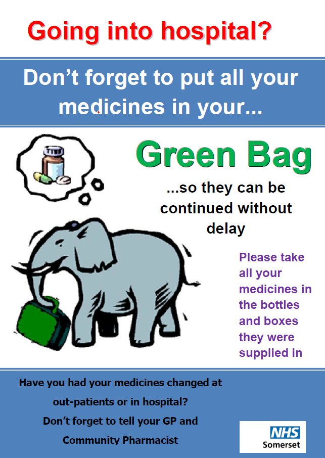 The purpose of this scheme is to encourage patients going into hospital (particularly as an inpatient or as an emergency) to take all their medications with them in a clearly identifiable bag (ie, the Green Bag) so that the hospital staff are aware of the medications you are taking, and the medications can stay with you if you transfer between wards or care settings. Knowing what medications are being taken by the patient helps the medical team in their initial assessment and ensuring patient safety.