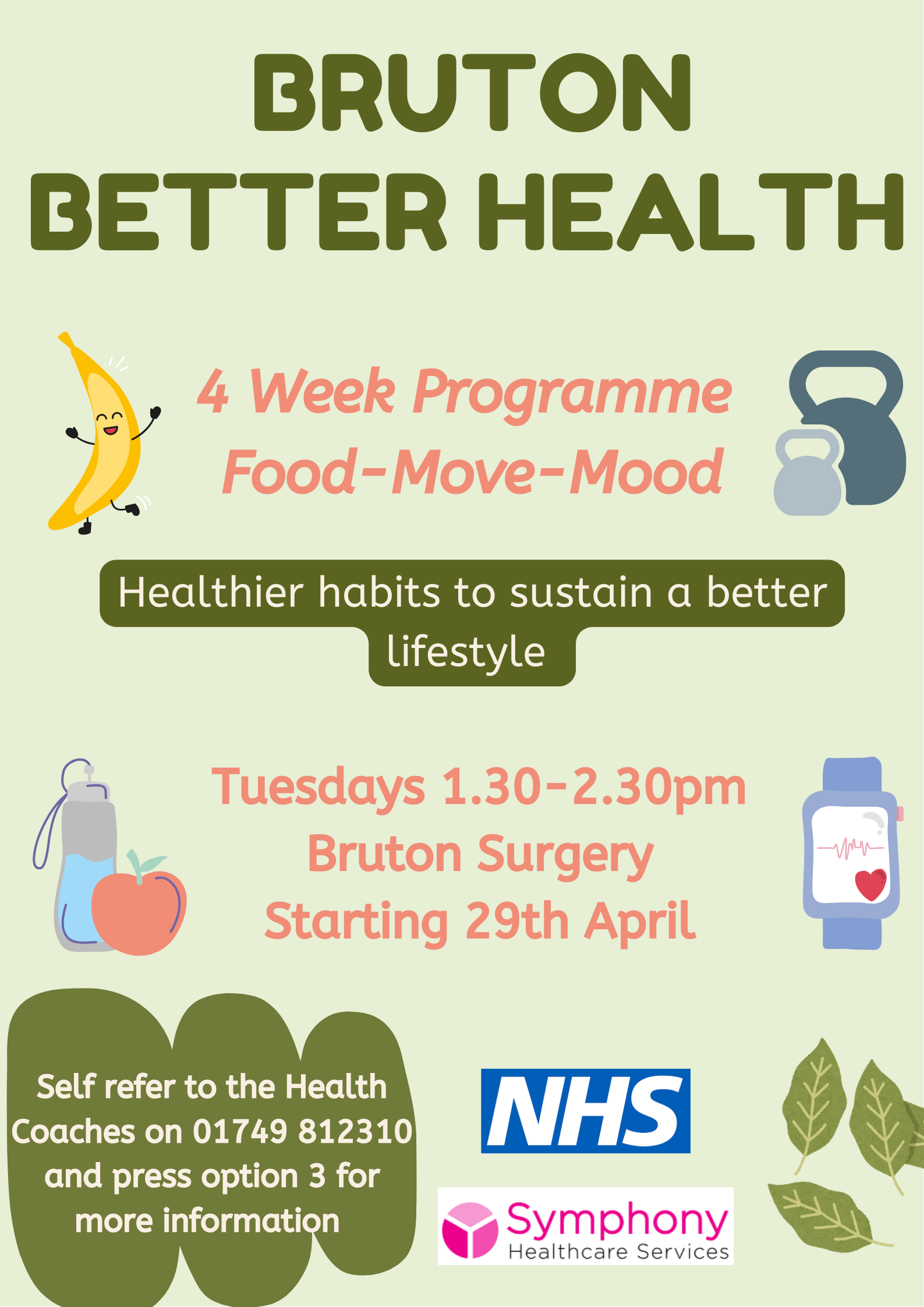 Our Healthcoach Team are providing a 4-week programme to support patients to sustain a better lifestyle through ‘food – move -mood’ starting on 29 April 2025.
