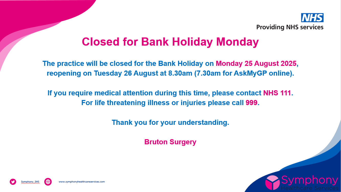 Please be aware that the practice will be closed on Bank Holiday Monday, reopening on Tuesday. For urgent medical needs over the Bank Holiday weekend, please contact 111 – or call 999 in the event of an emergency.