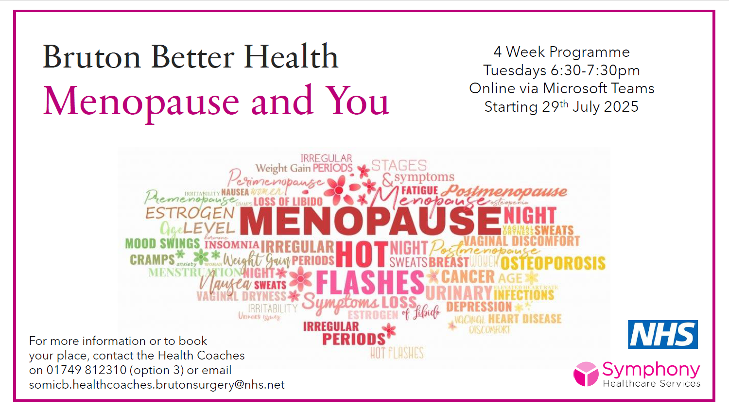 These sessions will focus on how lifestyle changes can help through the menopause rather than medication and will be hosted online via MS Teams. If interested please contact the team on 01749 812310 (option 3) or email somicb.healthcoaches.brutonsurgery@nhs.net.