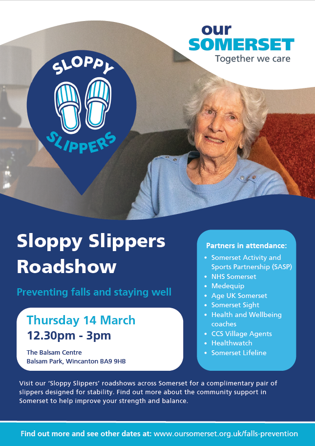 The Sloppy Slippers Roadshow is being held at the Balsam Centre, Wincanton on 14 March 2024 from 12.30 – 3.00pm. Details below: