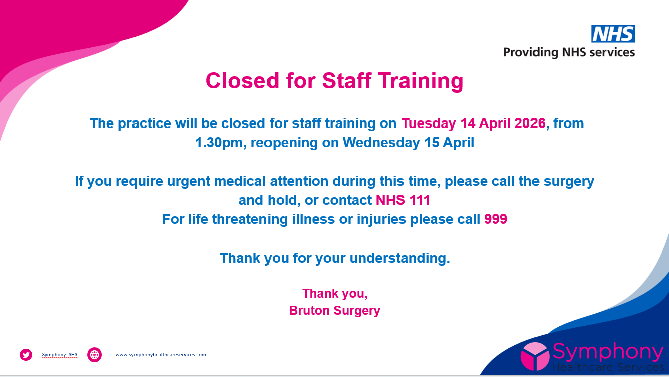 Please note that the practice will be closed for training on Tuesday 14 April from 1.00pm, reopening on Wednesday 15 April.